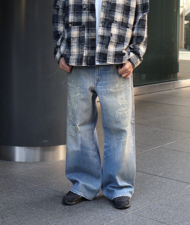 最新のプリント技術を使用し、グラフィックプリントでダメージ加工、着古した感じのデニムを表現したパンツ。実際にダメージがないので肌の露出や引っ掛かりがないの心配がありません。