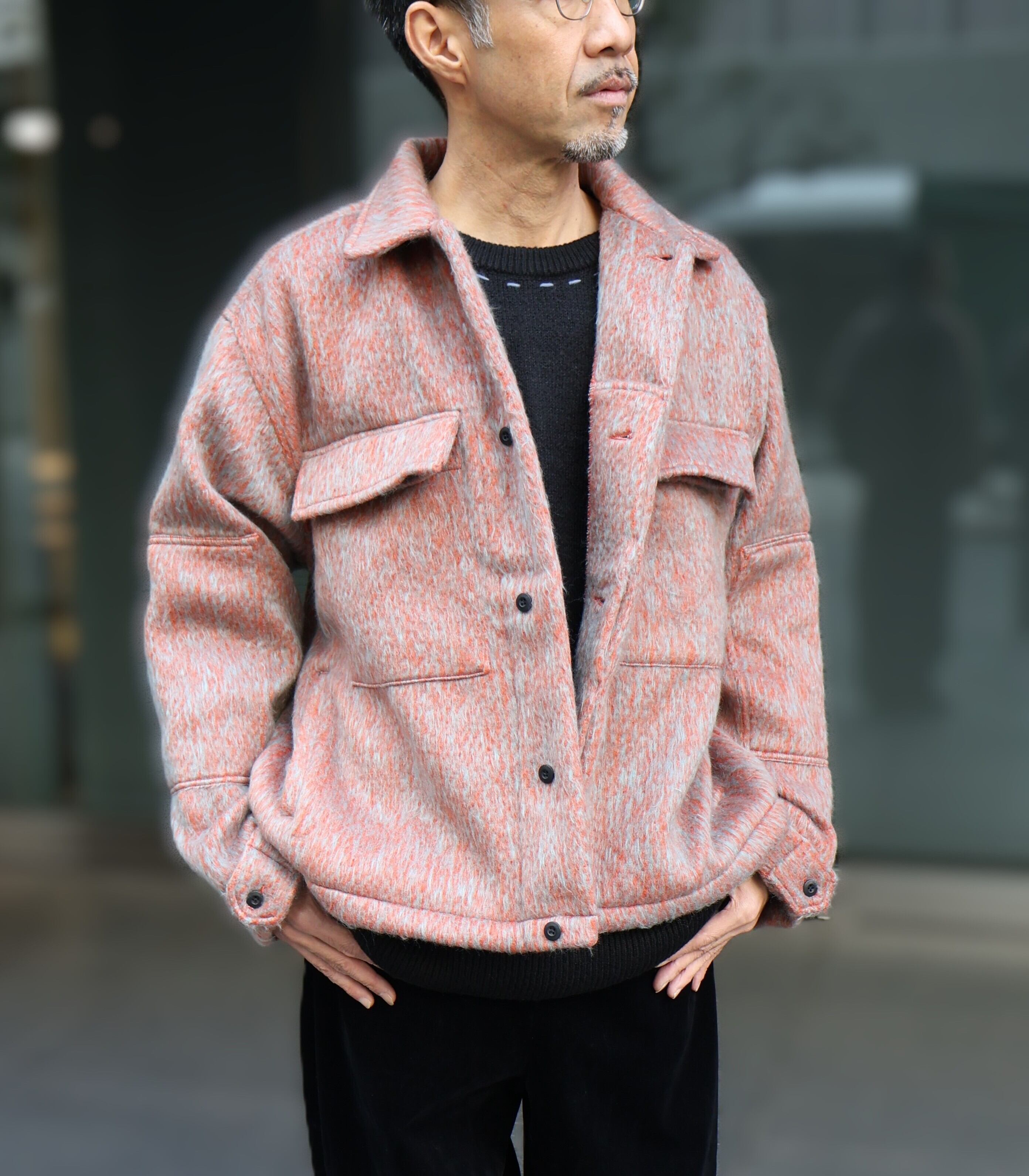表情豊かなメランジ糸で織り上げた、起毛感のあるシャギー素材を使用したブルゾン。