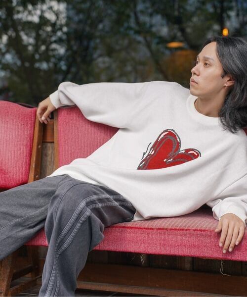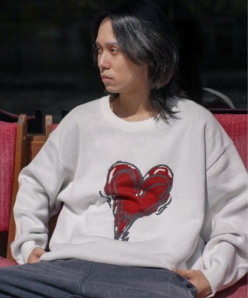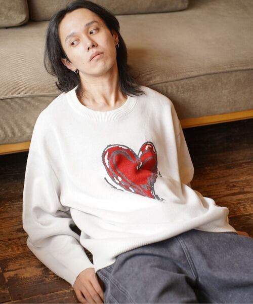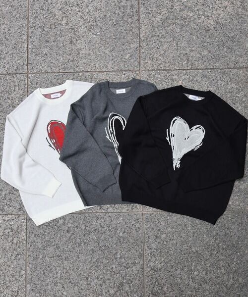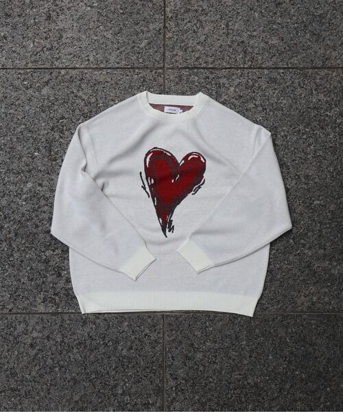 ATELANE スウェットライク ジャガード クルーネック ニット ハート オフホワイト