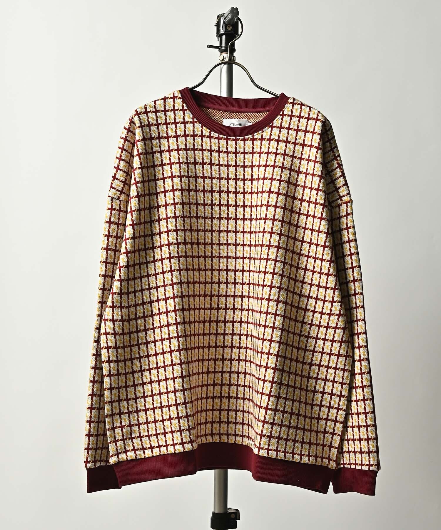 ポリエステル混紡ストレッチ素材にレトロな格子柄を全面に編んだ表情のあるデザイン。